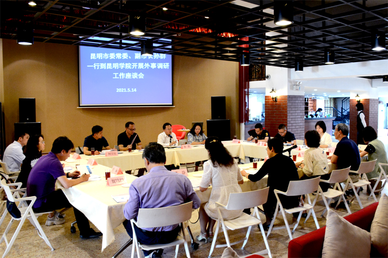 5月14日,昆明市委常委、副市长孙群一行到学校开展外事调研工作,学校校长丁文丽、党委副书记熊晶、副校长董建华陪同调研。