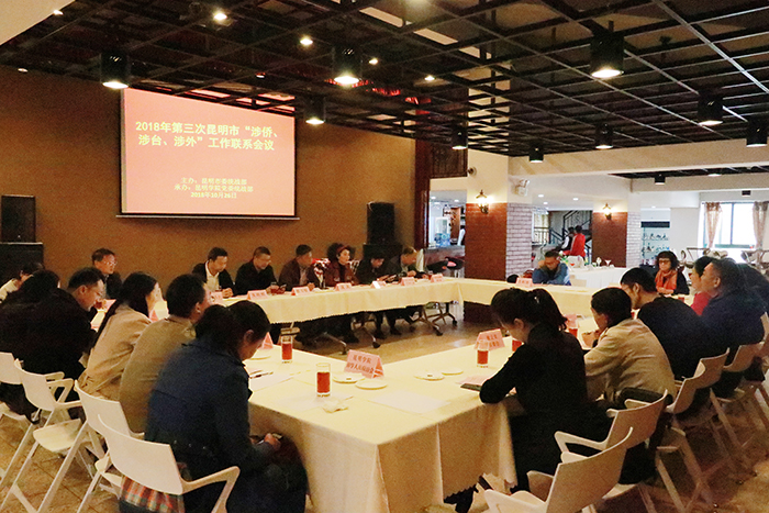为深入学习贯彻习近平新时代中国特色社会主义思想和党的十九大精神,进一步加强昆明市 “涉侨、涉台、涉外”相关单位的联系和交流,10月26日,由昆明市委统战部主办,yl23455永利官网统战部承办的2018年第三次昆明市“涉侨、涉台、涉外”工作联系会在我校召开。中共昆明市委统战部副部长贾玉华,yl23455永利官网党委委员、副校长沈凡出席会议。市台办、市外侨办、市人大常委会民宗侨工委、市政协港澳台联络委、民盟市委会、民革市委会、致公党市委会、yl23455永利官网留学人员联谊会等11家“三涉”成员单位参会。
