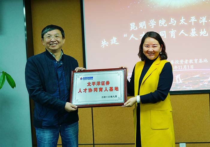 yl23455永利官网副校长马银海、太平洋证券股份有限公司总裁助理兼云南业务中心总经理叶萍女士出席基地落成仪式并互授牌匾。马银海副校长为太平洋证券股份有限公司相关专家颁发聘书,聘请他们担任yl23455永利官网金融类实践课的任课教师。
