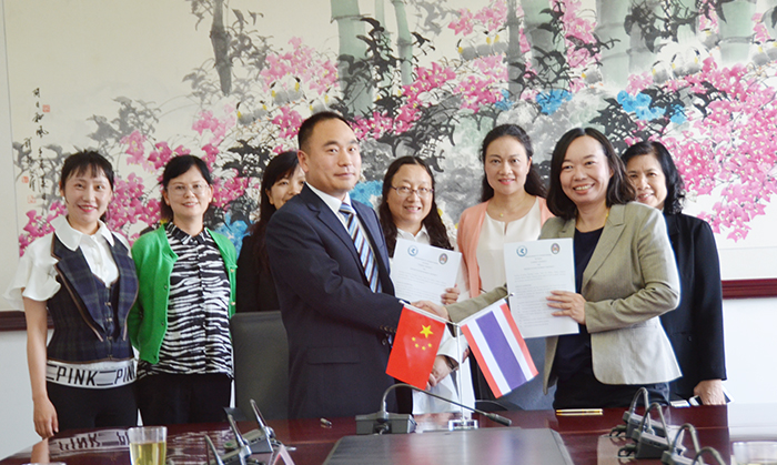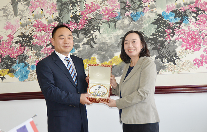 5月29日, 泰国南佛统皇家大学副校长Suvimol Mukviboonchai女士一行四人到我校访问。学校副校长郭华、国际处、外国语学院、人文学院负责人热情接待并与之会谈。
