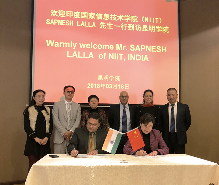 3月18日, 印度国家信息学院(NIIT)全球CEO赛普勒斯•拉乐先生Mr. Sapnesh Lalla、中国区总裁卡摩尔•杜普尔先生Mr. Kamal Dhuper、中国政府事务和商务拓展总监徐海峰先生、西南区域负责人袁野先生一行来访我校。我校校长黎素梅、副校长熊晶及相关部门负责人陪同来访客人参观教学、科研实验室。我校一流的教学、科研实验室给来访客人留下了深刻的印象。