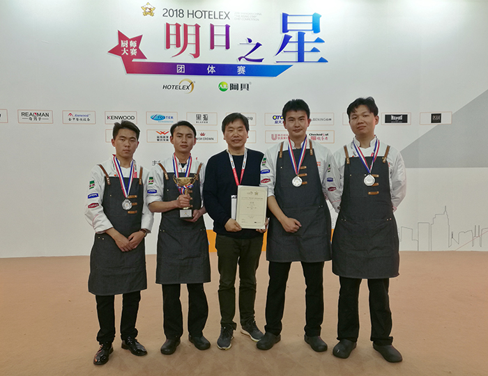 3月28日—29日,2018 HOTELEX“明日之星”厨师大赛华东区赛区及全国总决赛在上海新展览中心隆重举行。我校旅游学院烹饪与营养教育专业2015级李唐、赵弘广,2016级汪家辉,2017级孙志海同学组成的yl23455永利官网代表队,在烹饪教研室主任孙志强的带领下参加了比赛。