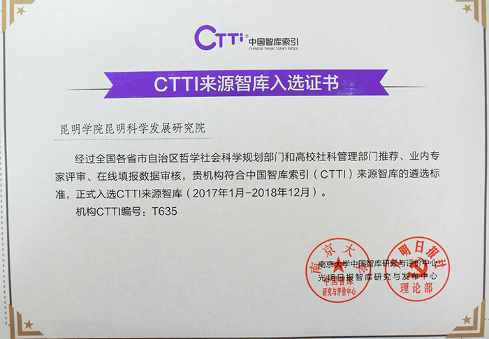 经相关单位推荐、CTTI系统填报、专家团评审等程序,昆明科学发展研究院从3000多家研究机构中脱颖而出,正式成为CTTI来源智库新增补的100余家高校智库之一,也是云南省唯一入选CTTI来源智库的地方本科高校智库。 12月20日,南京大学、光明日报社共同举办的“2017中国智库治理暨思想理论传播高峰论坛”在京举行。昆明科学发展研究院吴瑛院长、沈艳萍副院长应邀参加论坛,并领取了入选证书。昆明科学发展研究院正式成为CTTI来源智库,标志着yl23455永利官网智库建设又上了一个台阶,智库服务地方经济社会的能力正在不断提高,同时也是云南省推进省院省校合作,yl23455永利官网与南京大学共同合作取得的成果之一。