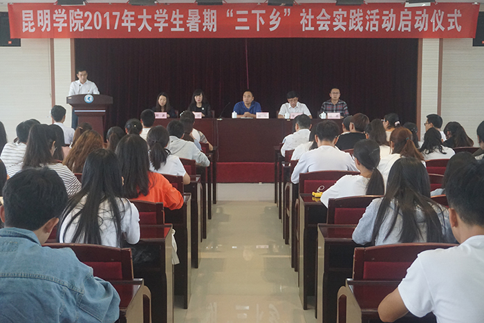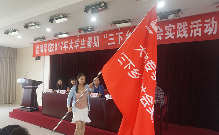 活动由校团委副书记沈嘉主持。组织“三下乡”社会实践活动的5个院系师生代表、各院系团总支书记及学生代表参加本次活动。 启动仪式上,带队教师代表及志愿者学生代表分别进行了讲话。教师代表胡文武老师表示,高校教师和团学工作者有责任引导和组织我校学生积极投身社会实践活动,引导广大学生更加坚定地跟党走中国特色社会主义道路。志愿者代表段光远同学鼓励志愿者以青春建新功的实际行动,为全面建成小康社会贡献青春力量。郭副校长为志愿服务队代表授旗,郎易副书记带领本次活动的全体志愿者宣誓。 郭副校长强调,我校开展暑期社会实践活动是引导广大青年学生走出校门、接触社会、了解国情,促进理论与实践相结合的良好形式。大学生暑期“三下乡”社会实践活动是把文化、科技、卫生等知识送到人民群众的生产生活中,是同学们积极投身社会,向实践学习,向群众学习,培养锻炼才干的重要渠道;是同学们提高思想觉悟,增强服务意识,促进健康成长的有效途径,也是深入开展“我的中国梦”活动的重要载体。他对参加本次社会实践活动的老师和同学们提出三点希望:第一,希望大家牢牢树立“安全第一”的思想,始终把安全工作放在第一位;第二,把社会当作大课堂,放下架子学本领;第三,要敢于吃苦,不怕困难,发扬“奉献、友爱、互助、进步”的志愿者精神,坚持学习书本知识和投身社会实践的统一。 本次大学生暑期“三下乡”社会实践活动以“喜迎十九大 青春建新功”为主题开展服务农村、学校、社区的社会调查、政策法规宣讲、民宿体验、参观考察、生产劳动、支教、科技兴农、文化宣传、基层医疗卫生服务、关爱农民工子女、文艺演出、大学生禁毒防艾志愿服务、服务青年就业创业等联系当地实际的活动,旨在教育我们要积极投身社会实践,努力践行“明德至善 知行利物”的校训。