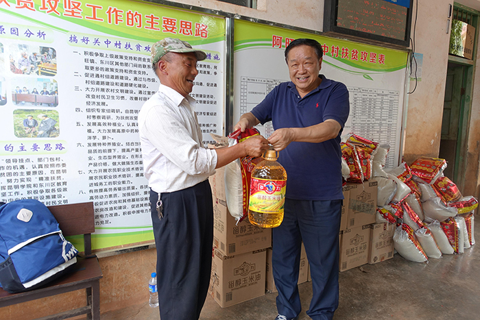 yl23455永利官网结对帮扶干部深入开展 “五个一”活动,进入建档立卡贫困户家中“开展一次入户调查活动、一次政策宣传活动、一次共同劳动活动、一次解决实际困难活动、一次帮扶措施落实活动”,并向挂包贫困户赠送了大米和食用油。孙勇向村委会移交了由学校组织部购置捐赠的价值5000余元的文体用品。贫困户们对yl23455永利官网实实在在的帮扶行动表示满意和感激。