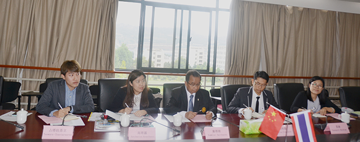6月20日, 泰国南邦皇家大学校长Somkiat Saithanoo博士一行五人到我校访问座谈。我校校长黎素梅、副校长熊晶、经济学院院长雷新华、外国语学院书记何昊辰、外国语学院副院长王云秀、国际处副处长陈静、国际处项目管理科科长夏玲热情接待并与之会谈。 在交流座谈会上,熊晶副校长为泰国南邦皇家大学校长Somkiat Saithanoo博士一行五人就我校概况、办学条件、校际交流项目以及学校办学特色等内容做出了详实的介绍。 黎素梅校长对泰国南邦皇家大学校长Somkiat Saithanoo博士一行五人的到访表示热烈地欢迎,指出双方的共同点,为将来两校间的合作发展指出明确的思路。 泰国南邦皇家大学校长Somkiat Saithanoo对我校的接待表示感谢,会谈中他介绍了南邦皇家大学的基本情况,与我校校领导、经济学院、外国语学院进行了深入的交流。通过座谈交流,泰国南邦皇家大学校长表示将力推两校间的合作交流。