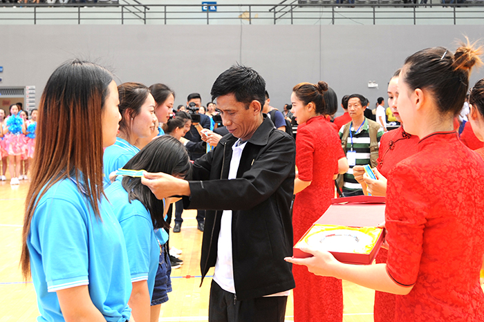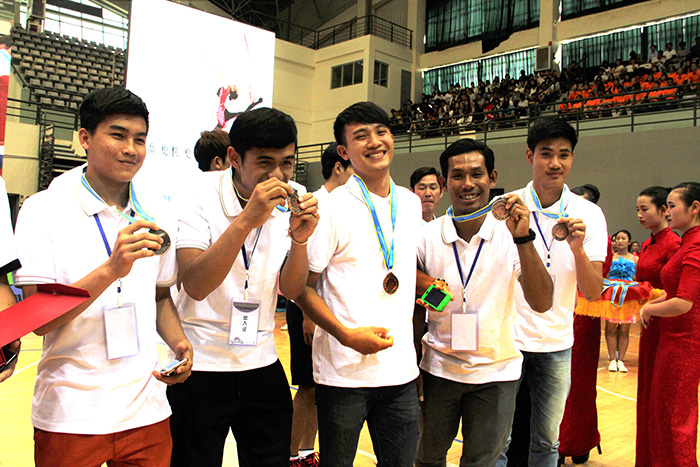 会上,出席闭幕式的领导、澜湄5国驻昆明总领馆官员为取得好成绩的各国大学生运动员代表颁奖。