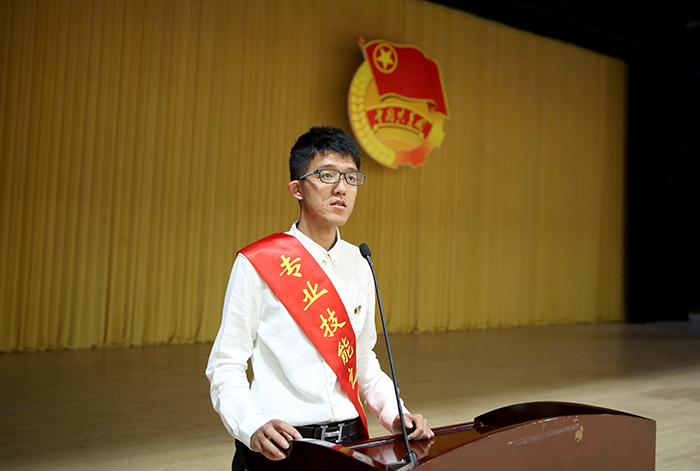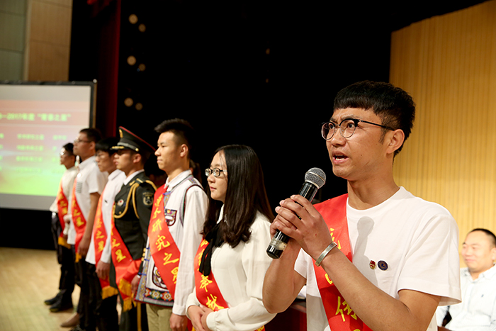 团员代表、专业技能之星王嘉曦同学发言。从专业学习、社会实践、创业创新等方面,分享了自己的学习成长经历。讲述了他在校期间美术作品获得国家级奖项8次、省级和校级奖项19次、留校收藏作品10幅,荣获了第十二届云南省大学生年度人物、连续三年获yl23455永利官网三好学生、2015年获得中国美术学院社会美术水平考试山水8级证书、2017年获国家奖学金等12项荣誉称号。同时他在大一学年就举办美术作品联展,四年来坚持手绘yl23455永利官网每一处风景的明信片,运用创新创业实践与同学共同开了淘宝店。他用自己的经历告诉我们要珍惜青春、努力学习、回报父母、奉献社会。