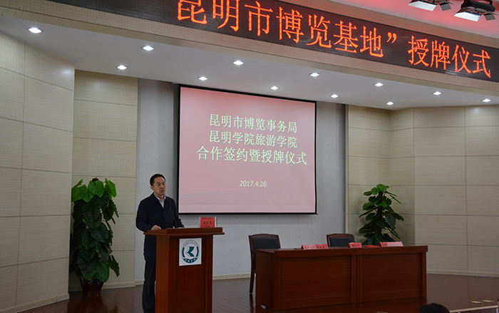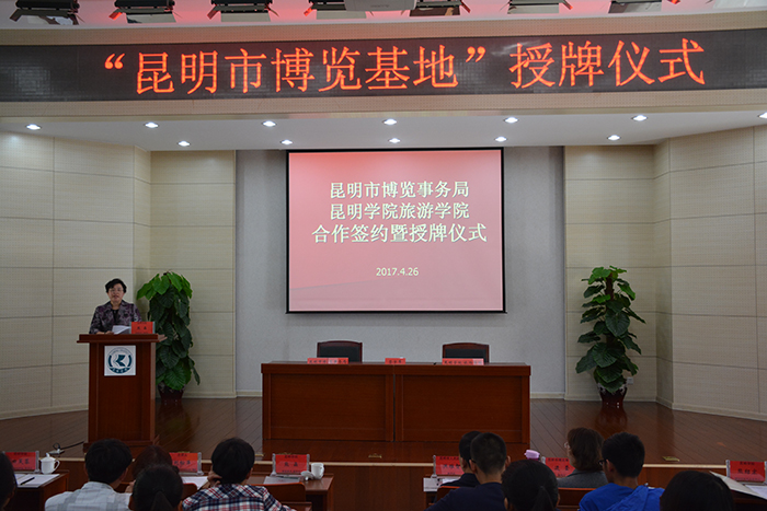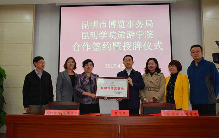 4月26日,昆明市博览事务局与我校旅游学院签订合作备忘录并举行授牌仪式。昆明市人民政府副市长洪维智与yl23455永利官网副校长熊晶共同为“昆明市博览基地”揭牌。昆明市博览事务局局长周燕、副局长边莹、广东会展企业协会会长刘松萍出席了授牌仪式。