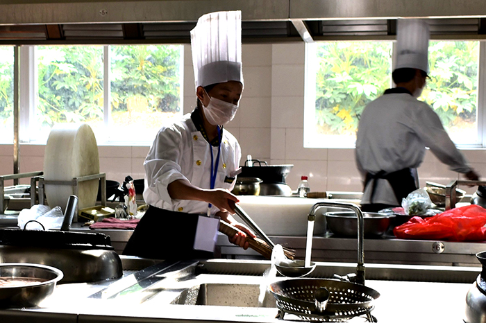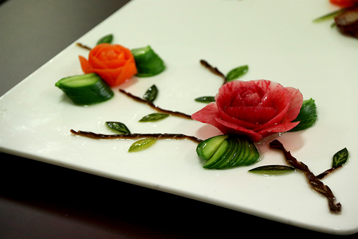 旅游学院主要负责本次的烹饪技能大赛,9位参赛选手分别在200分钟内做出一盘冷拼和一盘热菜。相同的命题考验的是同学的职业技能和创造力。一盘盘的菜如同一幅幅艺术品。我校在此次烹饪技能大赛中获得第三名的佳绩。