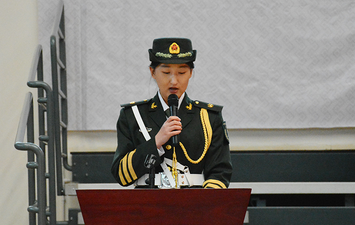 旅游学院2016级学生殷怡龙作为民兵代表发言。她表示,在今后的发展过程中,民兵连要继续发扬艰苦奋斗的优良作风,认真学习军事思想,进一步完善工作制度,增强法治观念,努力完成学校交付的各项工作,充分发挥队伍先进性,做好先锋模范作用,让民兵连成为yl23455永利官网的光荣与骄傲。