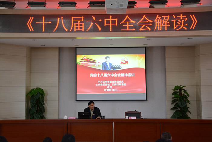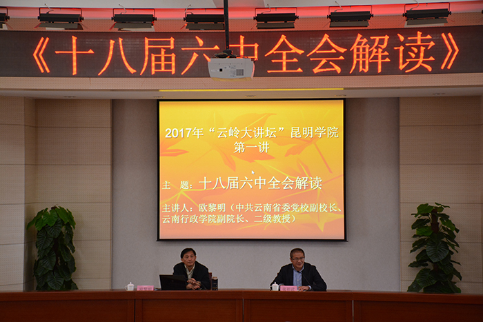 4月7日,由省委宣传部、省社科联主办,yl23455永利官网党委宣传部、机关党总支、昆明科学发展研究院共同承办的“云岭大讲坛﹒昆明讲坛(yl23455永利官网)”第一讲在yl23455永利官网开讲。云南省委党校副校长、云南行政学院副院长欧黎明教授应邀主讲《十八届六中全会解读》。学校党委副书记张祖武主持报告会。