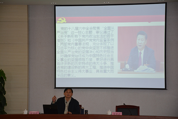 欧黎明教授以深入浅出、通俗易懂的方式,从“坚定理想信念、四个意识、全面从严治党、全面建成小康社会”等几个方面深入解读了十八届六中全会精神。他认为,党的十八大的重大意义在于明确了以习近平同志为核心的党中央领导地位,十八届六中全会抓住了全面从严治党的重点问题、关键问题就是“党要管党”,要规范党的行为,强化党员意识,而我们广大党员干部要强化“四个意识”,经受“四大考验”、克服“四种危险”,坚定理想信念不要动摇。
