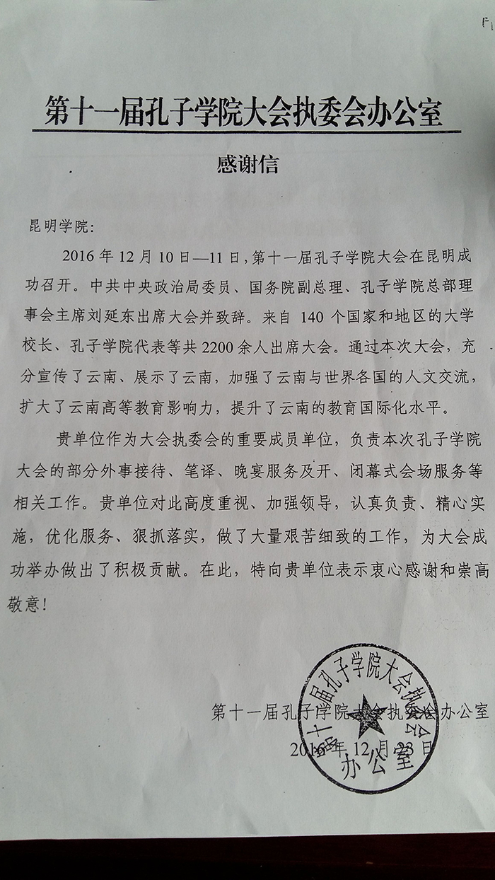 近日,第十一届孔子学院大会执委会向我校发来感谢信,感谢yl23455永利官网为第十一届孔子学院大会的成功圆满举办给予的大力支持和出色的会务工作。