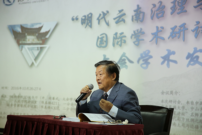 闭幕式上,毛佩琦教授作会议总结讲话。他指出,本次研讨会层次高、亮点多、现实价值大。体现在研究题目多层化,就主题来看,有从中央到民间社会,可谓多层次,又有研究有人物、制度、思想文化等方面,这是历次学术会议所没有的;研究队伍的广泛化,有民间文物馆、中国社科院、各高校及其他史学爱好者,特别是地方学者的参与使得研究成果和理念更为先进;以云南为主题,地域广泛化,把目光投入到了云南以外的地区,和云南进行对比性研究,取得不错成果,可以说本次研究既看到了视野,也提出了期待;研究方法多样化,把传统史学研究方法和民族学、人类学、社会学等的研究方法结合起来,研究题目也有多样化,如本次会议还涉及到香料史的研究;带有国际化倾向,无论是从“明代云南的治理与开发”国际学术会议这个主题来看,还是从论文角度来看都有所凸显,如参会人员既有中国学者,还有美国学者鲁大维等,论文上也有从明代安南与云南关系入手的;不仅关注历史,也关注现实,使国家的“一带一路”政策得以在史学研究中体现。