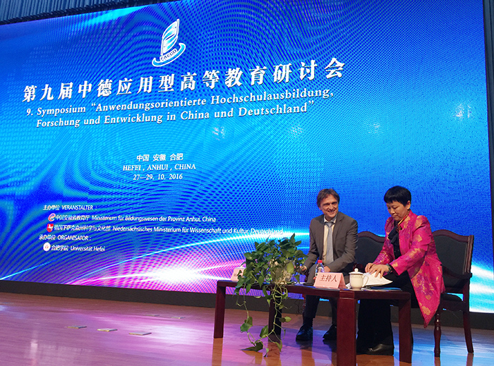 10月28日、29日,黎素梅校长应邀参加了由安徽省教育厅与德国下萨克森州科学与文化部主办,合肥学院承办的第九届中德应用型高等教育研讨会。研讨会的主题为基于“中国制造2025”与德国工业4.0背景下应用型大学的使命与变革,应用型大学校企协同育人和应用型大学的研究生教育。110家单位近340名国内外专家出席了研讨会,包括来自中国29个省市自治区93所中方院校的专家学者,以及来自德国奥斯纳布吕克应用科学大学、埃姆登•里尔应用科学大学、安哈尔特应用科学大学、德累斯顿学院等5所德国高校的校长和专家学者。
