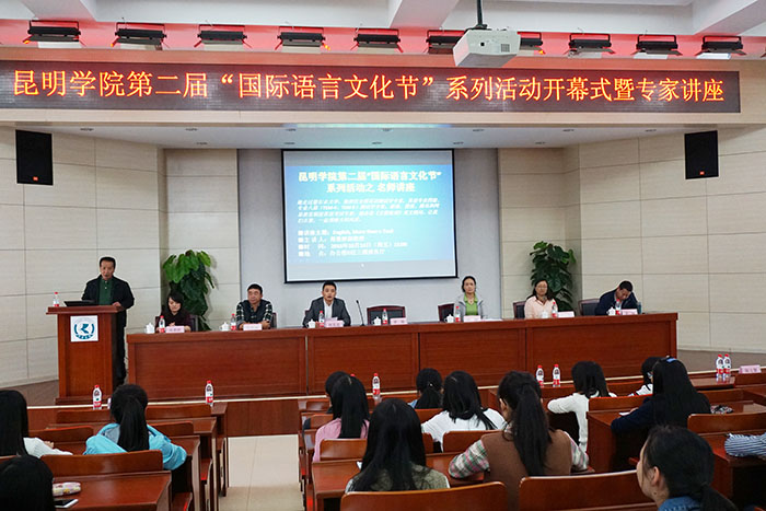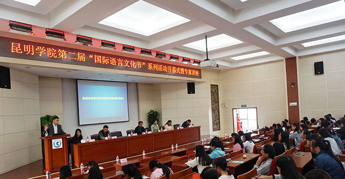 10月14日,yl23455永利官网第二届“外国语言文化节”开幕式暨名师讲座“English, More Than a Tool”在行政楼D区三楼报告厅如期举行。副校长李翔出席开幕式并致辞。国际交流合作处副处长陈静、外国语学院党总支书记何昊宸、副院长王云秀、党总支副书记马洪波及外国语学院督导昆明理工大学教授王庆奖教授、云南民族大学李强教授等参加开幕式,外国语学院2014级学生代表共计190余人齐聚一堂。开幕式由外国语学院党总支书记何昊宸主持。