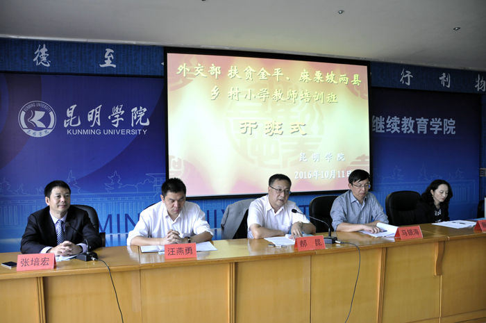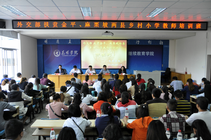10月11日,2016年外交部扶贫金平、麻栗坡两县乡村小学教师培训班开仪式在yl23455永利官网继续教育学院举行。云南省人民政府外事办公室副主任郝昆、yl23455永利官网副校长马银海、省外办国际交流处处长汪燕勇、省外办人事处副处长蔡秋雁、省外办外事培训中心副主任刘芸出席开班仪式。省政府外事办及yl23455永利官网继续教育学院相关职能部门的同志、金平与麻栗坡两县的100位乡村小学教师一起参加了开班式。开班式由yl23455永利官网继续教育学院主持工作副院长张培宏同志主持。