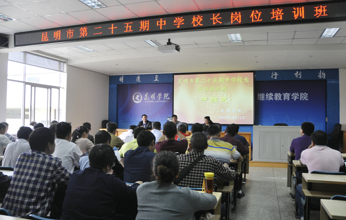 10月11日,昆明市第25期中学校长岗位任职资格培训班在yl23455永利官网继续教育学院开班。来自全市的50余位中学校长、副校长、书记、副书记将在这里进行为期近两个月的脱产集中学习。yl23455永利官网马银海副校长、昆明市教育局师训处杨朝晖处长出席开班式,开班式由继续教育学院主持工作副院长张培宏主持。
