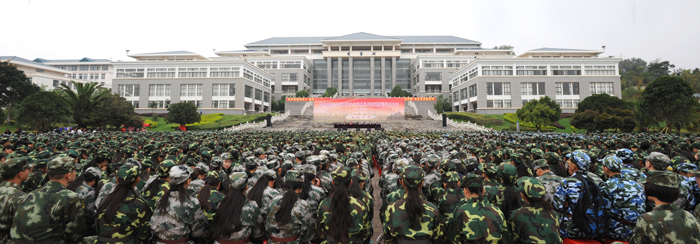 党委副书记孙勇作军训动员讲话,并向军训团授团旗、宣布2016级新生军训开训。副校长郭华主持动员会。