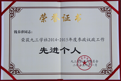 为鼓励先进,充分调动全社各级组织和广大社员参政议政的积极性,九三学社中央对2014-2015年度参政议政工作先进集体和先进个人进行了表彰,九三学社云南省委有4个基层组织、12名个人受到表彰。我校钱春萍老师荣获参政议政工作“先进个人”表彰。