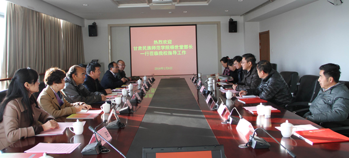 沈中灿代表学校对甘肃民族师范学院杨部长一行的到来表示欢迎,他向来宾介绍了我校的历史沿革、现状、办学特色以及学校统战工作情况,重点介绍了学校党委重视统战工作发挥统领作用,统战部工作机制创新以及统战成员在学校发展中的突出贡献等方面的情况。杨世堂部长也介绍了甘肃民族师范学院的情况。接着双方参会人员就学校党外知识分子工作、民族团结进步示范区建设等进行了深入的探讨和交流。