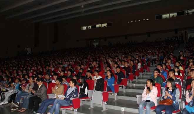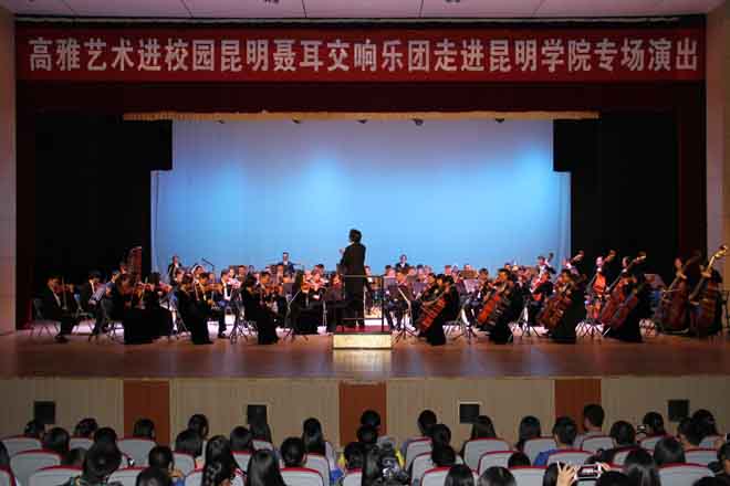 10月21日晚,2015年高雅艺术进校园之昆明聂耳交响乐团yl23455永利官网专场演出在学生会堂举行。副校长郭华、部分中层干部、各院(系)团总支书记、辅导员、各院(系)师生代表1000余人观看了演出。