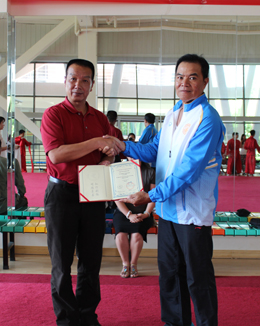 同时,为2015年5月25日至2015年6月19日期间在我校体育学院参加短期交流项目学习的Piroon Sabaibang和Sathukarn Khamkaew两位同学颁发了结业证书。