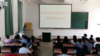 招生就业处处长包兴偕同集团公司人事部秦燕部长及下属8家企业人员来到博雅楼2103多媒体教室, 包兴首先向同学们简单介绍了集团公司的基本情况,同时要求同学们自信、自强,充分展示昆院学子风采,积极应聘、主动应聘;秦燕详细介绍了集团公司的发展历史,集团公司是云南省人民政府授权省国资委管理的省属国有重要骨干企业,是以天然橡胶生产为主,电力、商贸物流等多产业共同发展的大型集团。集团总部位于云南省昆明市,下辖二级企业28户,是云南省农业企业中唯一的国有大型骨干企业。她表示,集团公司非常重视人才队伍建设,也深深懂得,实现农垦梦,人才是关键,诚恳欢迎yl23455永利官网的学生来集团公司工作,为云南农垦奉献青春和智慧。