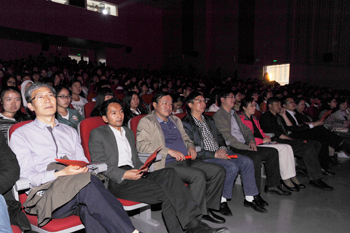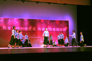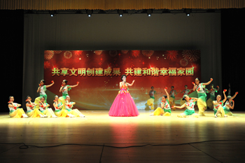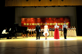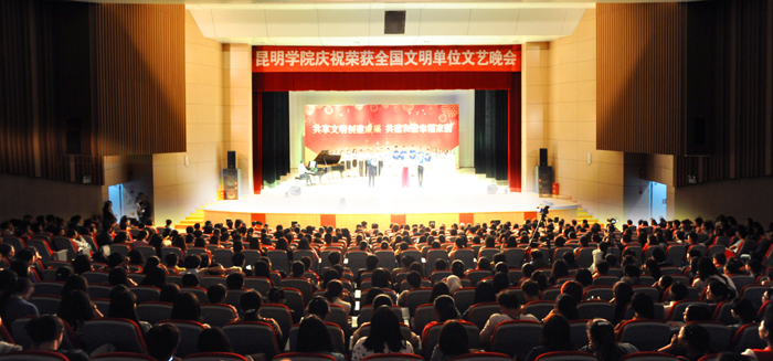 4月28日晚,“共享文明创建成果,共建和谐幸福家园”——庆祝我校荣获全国文明单位荣誉称号文艺晚会在学生会堂隆重举办。校长何华,党委副书记孙勇,副校长董建华,校长助理马银海及中层干部、各院系师生代表1300多人参加了庆祝晚会。