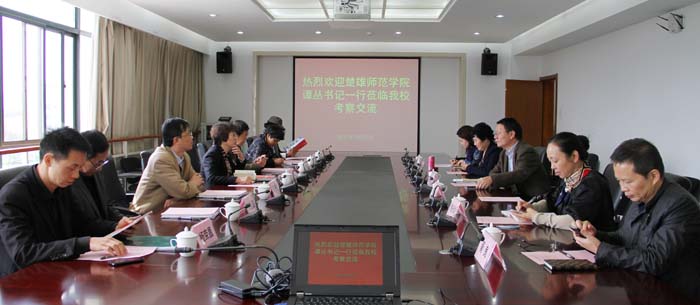 3月27日,楚雄师范学院党委书记谭丛一行7人到我校考察交流。我校党委书记陈世波、校长何华、党委副书记李媛芬及党办、旅游学院、学报相关对口单位领导参加接待并座谈。座谈会在办公楼411举行。