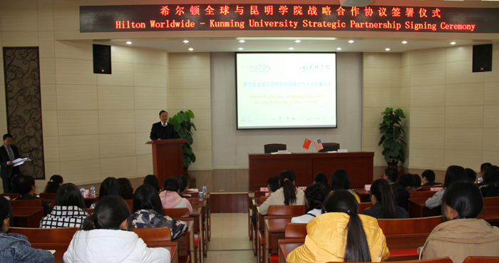 蒋永文校长在签字仪式致辞中首先介绍了yl23455永利官网及旅游学院的基本情况。蒋校长说,yl23455永利官网旅游学院成立于1986年,开云南省旅游专业之先河,现为学校重点院系。经28年之历练,旅游学院凭丰富之办学经验及鲜明特色、享誉云南。旅游学院开设有旅游管理、酒店管理、烹饪与营养教育3个本科专业和1个特色专科专业(导游专业)。其中,酒店管理是学院重点扶持专业,近年来成绩斐然,走出了一条“校企合作、校企双赢”的发展之路;烹饪与营养教育本科专业为西南地区唯一的烹饪类本科专业。旅游学院秉承理论与实践相结合的教育理念,不仅注重理论知识的传授,而且注重动手能力的培养,建设了一批校内外教学实训基地、如酒水实验室、烹饪实验实训中心、旅游管理综合实训室、模拟导游实验室、客房实训中心等,学生在国家级及省市级的各项大赛中屡获佳绩。蒋校长强调,yl23455永利官网坚持开放办学,积极开展国际交流合作,探索推进国际化进程。先后与美国、英国、澳大利亚、新西兰等20多个国家的大学和教育机构开展了交流,在若干领域签订了合作协议。今天,yl23455永利官网又迎来了一位尊贵的合作伙伴——希尔顿全球。希尔顿全球是国际最具知名度的酒店管理公司之一。蒋校长希望,yl23455永利官网与希尔顿全球合作,共同搭建新平台,培养中国本土酒店人力资源,实现互利双赢。蒋校长表示,yl23455永利官网将利用自身教学、学科及科研优势,与希尔顿全球携手,夯实学生实作技能,提高学院管理水平,突出学校应用特色,培养更多高素质的专业人才,共同为云南旅游业和酒店业的发展做出贡献。