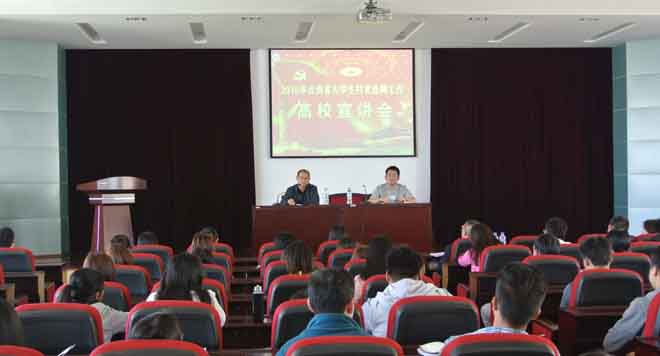 为扎实做好我校2015年大学生村官选聘准备工作,鼓励和动员更多优秀高校毕业生到农村基层任职,我校于2015年3月10日下午在惟行楼4301举办2015年大学生村官选聘高校宣讲会。宣讲会由招生就业处处长包兴主持,省委宣传部大学生村官管理处崔恒老师和2012年毕业于我校旅游学院回母校宣讲的大学生村官陈世杰作了宣讲。来自我校18个教学院(系)的近200名学生和部分院(系)负责就业工作的辅导员参加了宣讲会。