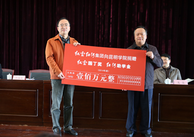 仪式上,范晓厂长代表红云红河集团昆明卷烟厂向yl23455永利官网捐赠100万元奖教助学金,蒋永文校长代表yl23455永利官网接受捐赠。
