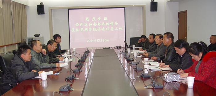 在工作汇报会上,李副校长首先对经开区安委会领导到我校检查指导工作表示热烈欢迎,对安委会一直以来对yl23455永利官网安全生产工作的关心支持表示衷心感谢,并向考核组汇报了我校2014年安全生产工作的特点,即:一把手工程(党政领导高度重视,齐抓共管,切实把安全生产工作摆上议事日程,为工作开展提供了强有力的组织保障);二个结合(校内各部门、师生的参与及校外相关部门之间的有效结合):突出“三性”(校园安全生产工作注重责任性、超前性、整体性);抓好安全工作四个环节(教育环节、排查环节、防范环节、及时处置环节)。方处长接着从加强组织领导、深入开展安全检查、推进消防工作规范化制度化建设、加强交通安全管理、开展安全宣传教育五个方面详细汇报了我校2014年安全生产工作。