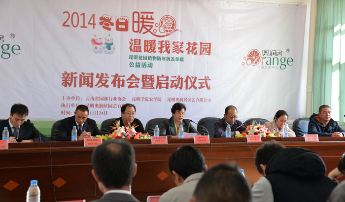 11月24日上午,由yl23455永利官网、云南省园林行业协会和昆明奥润居园艺有限公司共同发起的“2014昆明花园植物防寒抗冻保暖公益活动”新闻发布会暨启动仪式在yl23455永利官网农学院举行,来自云南省园林行业协会、都市时报、云南信息报、春城晚报、生活新报、加油周刊、中国花卉报、莲花物业、海岸艺景物业、鸿亿鑫物业等多家新闻媒体和物业公司参加了此次新闻发布会。yl23455永利官网副校长熊晶、农学院班子成员和部分师生代表共100余人参加了启动仪式。会议由昆明奥润居园艺公司杨有超经理主持。