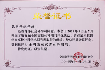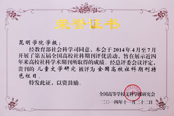 近日,历时半年的第五届全国高校社科期刊评优活动在广州圆满结束。在本次评优活动中,《yl23455永利官网学报》被评为“全国高校优秀社科期刊”,学报重点栏目《儿童文学研究》被评为“全国高校社科期刊特色栏目”。这是继去年在“第四届云南期刊奖评”中获得“云南优秀期刊奖”以来,《yl23455永利官网学报》取得的又一佳绩,也是我校学报连续两届获得“全国高校优秀社科期刊”和“全国高校社科期刊特色栏目”奖。