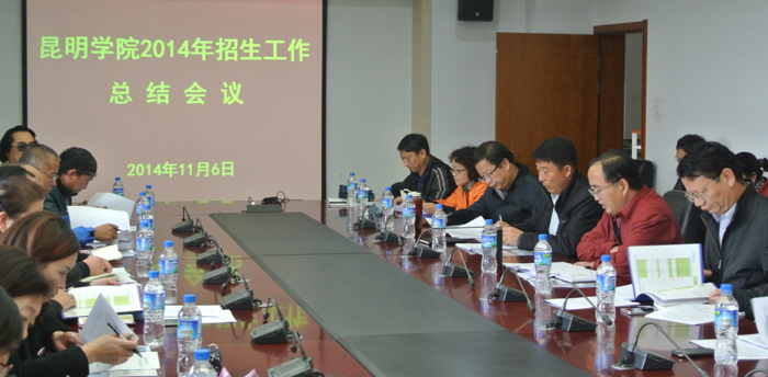 首先,招生就业处处长包兴汇报了2014年学校招生工作的总体情况及招生工作取得的成效:1.生源质量好,本科录取最低分高出本科控制线文科24分,理科18分。省内外本、专科投档率均在105.3%;2.新生录取率和报到率均比去年有较大提高,达到最好水平;3.定向在云南省93个贫困县招收少数民族预科生和定向昆明市二、三板块招收免费师范生是学校今年新增加的本科招生项目,招生录取工作顺利完成。定向免费师范生的招生实现了招生、培养、就业联动,为学校今后以免费师范生培养为契机,进而把师范生培养打造成学校的特色和品牌,探索出了另一条新路。同时对教育部《关于深化考试招生制度改革的实施意见》和省招生考试院2014年招生工作总结会议精神作了传达。