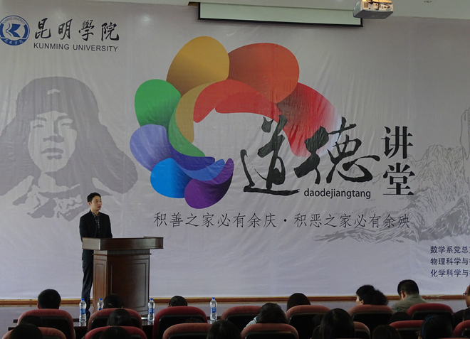 道德讲堂围绕我校数学系2011级数学与应用数学专业师范1班的付贵帅同学为了营救落水同伴献出了他年仅20岁的年轻生命的事迹,开展“学习付贵帅同学,弘扬乐于助人的精神”道德讲堂,按照“唱歌曲、学模范、诵经典、发善心、送吉祥”五个环节进行。讲堂通过全体师生唱歌曲《爱的奉献》,观看由昆明电视台、昆明日报、都市时报等多家媒体联合专访付贵帅同学见义勇为事迹的新闻短片和由学校党委书记陈世波和校长蒋永文策化、熊副校长牵头录制的微电影《生命的托举》,听取他的班主任老师《怀念我的学生》,三个身边同学《我的老同学》《热爱生活的付贵帅》《助人为乐的高个子男生》的讲述之后,让参加讲座的同学们对付贵帅的英勇事迹有了深入的了解。让每一个年轻大学生的心灵受到了深深地震撼。在互动环节,三个系的同学争先恐后的畅谈自己的感受,特别是物理科学技术系付远旺、王振远同学“本来听讲座是报着来混的思想,后来深深被打动。道德养成是要从小善积成大善”的发言引发全体师生的深刻反思:生命是那么脆弱,不堪一击,生命是这样不可逆转,让人无法后悔。付贵帅学长的离去警醒我们要学会珍惜自己的生命,绝不能浪费生命里宝贵的时间,趁自己还年轻多做一些有意义的事情。生命不能重来,所以,要努力实现自己人生的价值。学习付贵帅学长身上的优秀道德品质。看事迹,想事情,学精神,从小事做起,从身边做起。去实践,去感染,去带动更多的人参与进来,为社会尽一份微薄的力量。