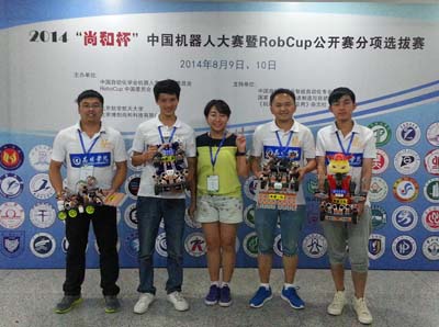 我校机器人团队于8月7 ~10日参加了北京举办的2014“尚和杯”中国机器人大赛暨Robo Cup公开赛分项选拔赛,通过机器人武术擂台赛标准平台无差别项目(1v1)、机器人武术擂台赛规定动作技术挑战赛和标准平台仿人项目(1v1)三项赛事的层层淘汰,获得了参加2014中国机器人大赛全国总决赛的资格,并最终在全国总决赛中获得了优异成绩。