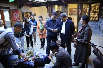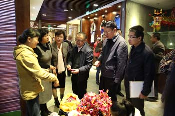 三是“非遗传承人进校园”活动同时在馆内举行。在博物馆三年的研究建设过程中,滇合中心与滇池流域的非遗传承人建立了密切的联系。借开馆之机,滇合中心联合美艺学院邀请了市级“子君人阿乌”制作传承人李利春、呈贡区“菱角”编制传承人李留美在馆内做活态展示,同时美艺学院相关专业师生也到馆学习、观摩。