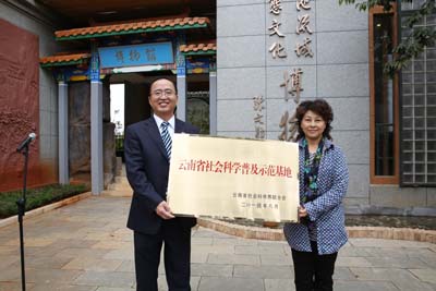 二是云南省社会科学普及示范基地在博物馆挂牌。“滇池流域生态文化博物馆”自建设以来,得到了社会各界的关心和支持,在面向师生试开放期间就获得好评,也吸引了更多研究人员的参与。经学校申报,云南省社会科学联合会决定将“滇池流域生态文化博物馆”命名为“云南省社会科学科普教育示范基地”。博物馆揭牌后,省社科联副主席靳昆萍为“滇池流域生态文化博物馆”授牌,我校校长蒋永文接牌。随后,各位来宾、学校领导及师生参观了博物馆。