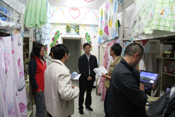 每到一间宿舍,刘副校长都详细询问学生的学习、生活情况,了解同学在宿舍使用网络的情况以及学生对学校网络建设的意见和建议。相关技术人员使用网络技术设备对宿舍网络进行了实际测试。经过测试,两家运营商在试点的润泽苑13、14栋学生宿舍内的实际网速均在1M/s以上,同学们对现有网速也比较满意,希望学校能想办法维持现有网速,给同学们营造一个较好的校园网络环境。
