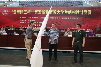 颁奖仪式后,举行承办单位交旗仪式。“云南建工杯”云南省大学生结构设计竞赛主办单位代表云南省教育厅高教处调研员谢怀昆宣布,第六届竞赛承办单位昆明理工大学,并从第五届竞赛承办单位yl23455永利官网副校长董建华手中接过会旗,交到第六届竞赛承办单位昆明理工大学副校长牛治喨手中。牛副校长接过会旗后挥旗示意,并代表第六届云南省大学生结构设计竞赛承办单位欢迎各高校选手2015年相聚昆明理工大学。