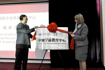 蒋永文校长在仪式上致辞。他首先代表学校欢迎加拿大凯布莱恩学院副校长布朗女士一行到我校参加“中加学前教育中心”揭牌仪式表示热烈欢迎。他说,从去年10月至今,yl23455永利官网与加拿大凯布莱恩学院的合作,在加拿大驻重庆总领事馆的积极推动下,今天迎来了 “中加学前教育中心”的成立,标志着两校合作迈出了历史性的重要一步。凯布莱恩学院位于加拿大安大略省萨德伯雷市,这座城市也是约翰斯顿总督的故里,这也为我们之间的合作增添了特殊的意义。在这里,特别感谢加拿大凯布莱恩学院副校长布朗女士、国际部主任道顿先生和中国项目负责人杨传秀女士为“中加学前教育中心”的成立所做的大量工作,感谢云南省教育厅和加拿大驻重庆总领事馆为两校的合作提供的大力支持,感谢加拿大驻重庆总领事馆教育专员廖忠博士在“中加学前教育中心”筹建的过程中提供的所有帮助和指导。