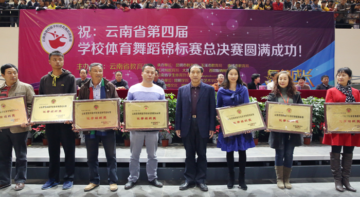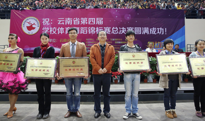 开幕式上,还举行了“云南省第四届学校体育舞蹈锦标赛”优秀组织奖颁奖仪式。罗嘉福副厅长分别为“教育局优秀组织奖”获得者颁奖,他们是昆明市教育局、玉溪市教育局、大理州教育局、红河州教育局、曲靖市教育局西双版纳州教育局、文山州教育局6个单位。蒋永文校长分别为“大学院校优秀组织奖”获得者颁奖,他们是yl23455永利官网、云南大学、西南林业大学、云南财经大学、云南师范大学和云南师范大学附属中学。