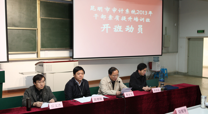12月5日上午,“昆明市审计系统2013年干部素质提升培训班”开班动员大会在我校博识楼2003报告厅举行。我校党委副书记、校长蒋永文,昆明市审计局党委书记郭增敏,昆明市审计局局长李冰晶出席开班动员大会。会议由昆明市审计局机关党委书记后文杰主持。