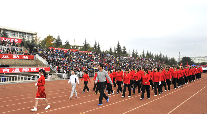 教职工代表队进行了广播操和太极拳表演。旅游学院、音乐学院、化学科学与技术系和生命科学与技术系以及医学院的同学们表演了团体操。