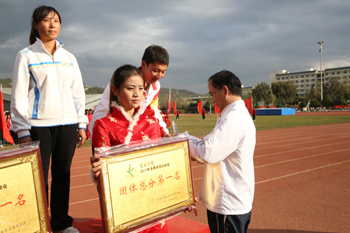 颁奖仪式后,熊副校长致闭幕词。她首先向在本次运动会上取得优异成绩的集体和个人表示热烈的祝贺,向三天来辛勤工作、任劳任怨的全体裁判员、工作人员表示衷心的感谢和亲切的慰问。熊副校长指出,通过本届运动会,一批身体条件较好、运动素质较高、竞技能力较强的同学脱颖而出,他们不仅是代表队的骄傲,也是学校的骄傲。在教职工竞技项目中,广大教职工积极参与,特别是环校园长跑比赛中,陈书记、蒋校长等校领导带头参加,充分展现了我校全民健身活动热潮和教职工团结协作、昂扬向上的精神与活力。