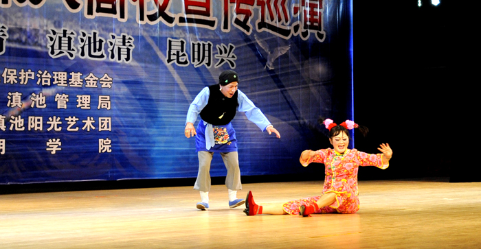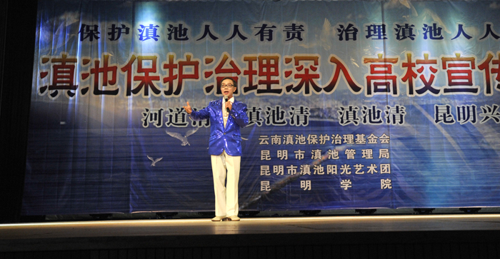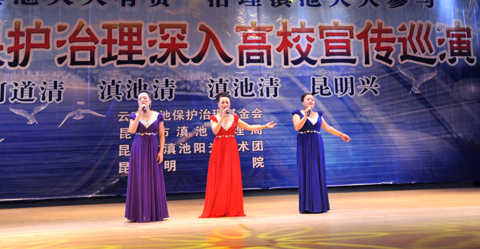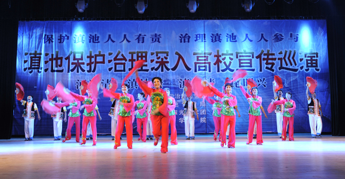 演出中,艺术团把滇池保护治理及生活中的环保知识穿插于每一个节目演出前的介绍中,通过小品与师生的互动,让师生进一步增强保护滇池人人有责,治理滇池人人参与的意识,用自己的一言一行,宣传和感染身边的人们,以实际行动,积极投入到滇池的保护与治理工作中,为我们美丽的母亲湖、为美丽的昆明做出应有的一份贡献。